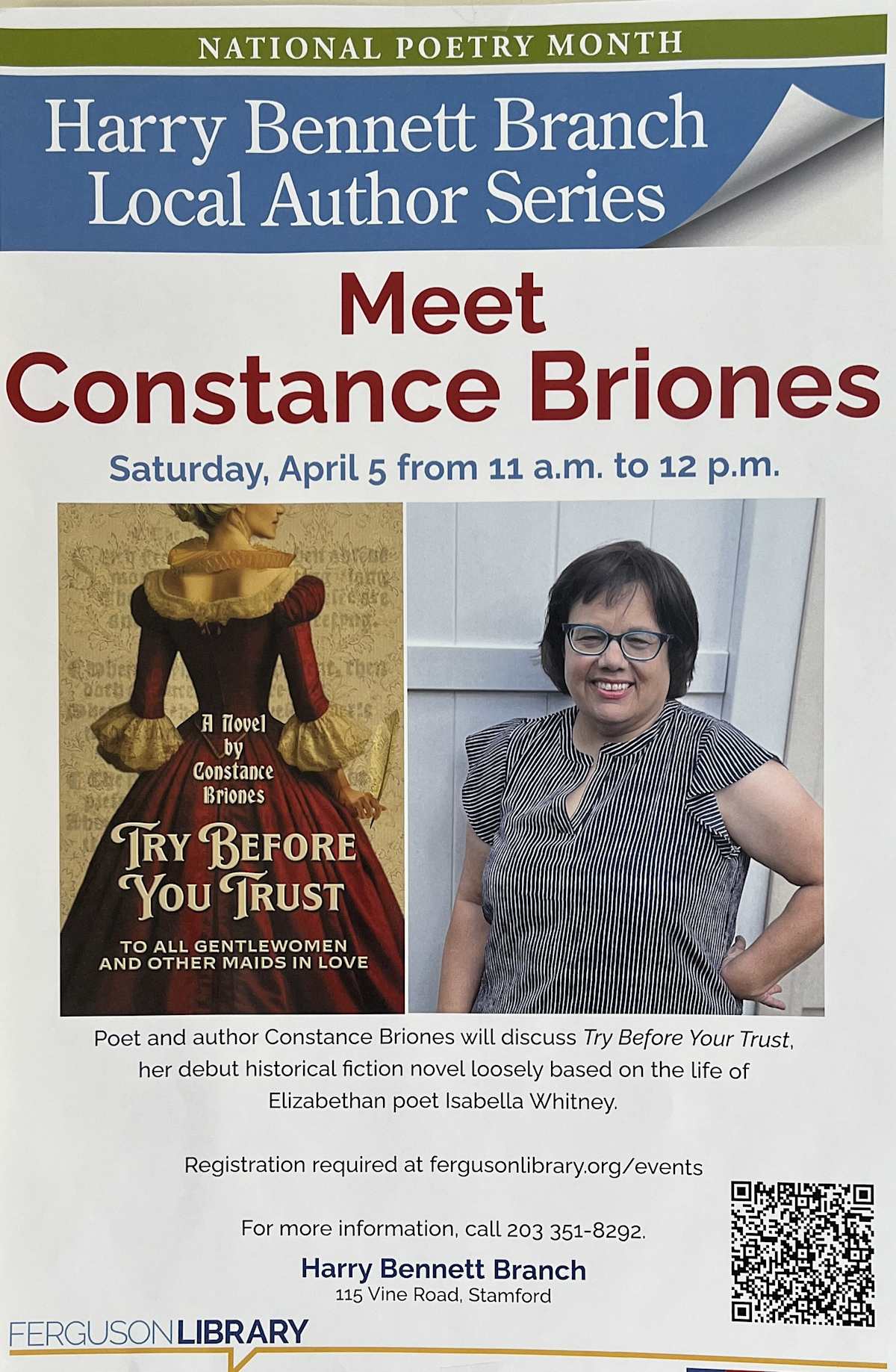 During National Poetry Month I gave a talk about the subject of my book, English poet Isabella Whitney, an obsure poet who lived in sixteenth centurey London. Whitney is credited with being the first English woman to write about men-women relationships in a time when relgious translations were the only viable writing endeavor for women. I was thrilled to read an excerpt from her poem, THE ADMONITION BY THE AUCTOR, TO ALL YOUNG GENTLEWOMEN: AND TO ALL OTHER MAIDS BEING IN LOVE.